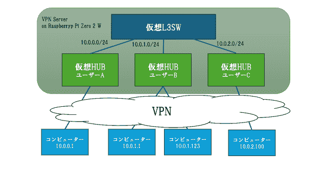 これはSoftEther VPNを使った仮想的なL3ネットワークで、